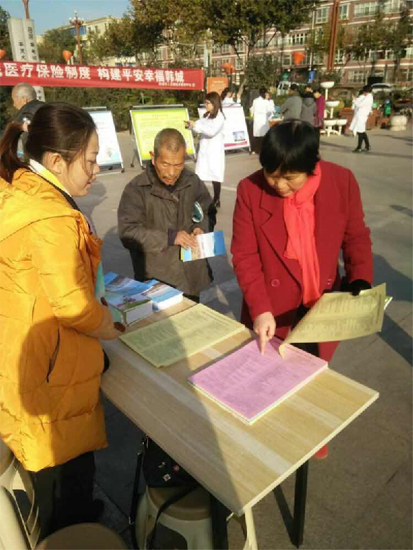 为了提高我市广大市民对韩城市城乡居民医保政策的知晓率。11月22日,市人社局城乡居民医保中心组织市医院、市中医医院、矿务局总医院、妇幼保健计生服务中心和交大一附韩城医院等五家定点医疗机构,在禹甸园广场设点,为广大市民现场解读城乡居民基本医疗保险相关政策。